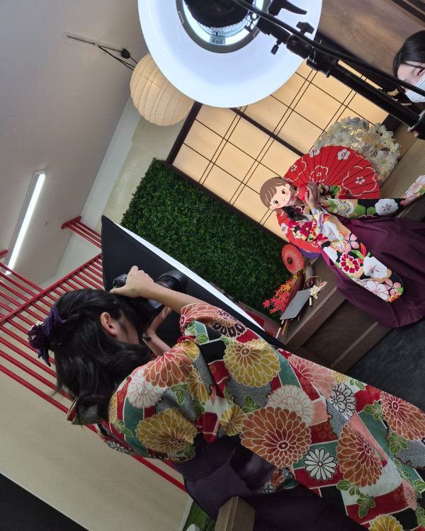 今回は、初めて会う小学生の女の子2人にご参加いただき、袴の着付けやヘアメイク体験、そしてカメラを使った撮影体験に挑戦していただきました📷