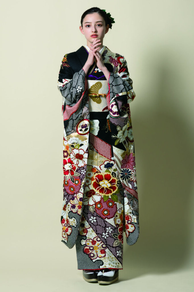 黒や赤を基調に、深みのあるカーキ・オレンジ・えんじ・ゴールドなどの暖色系で構成されたクラシカルな振袖。