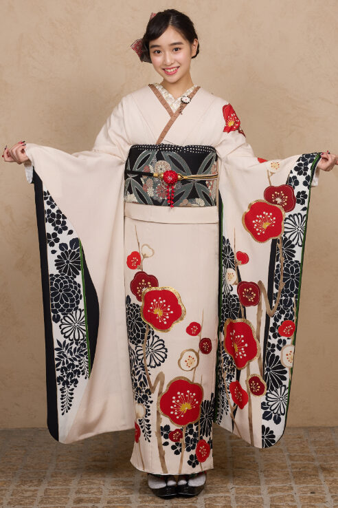 生成り色に古典のころんとした梅がかわいらしい、クラシックな雰囲気の振袖
