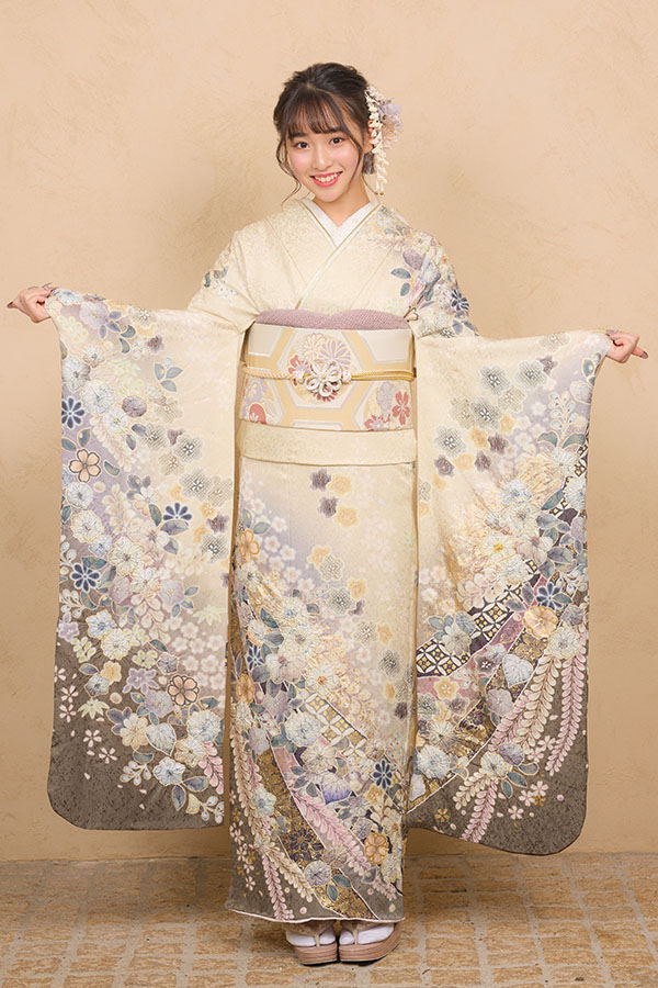 アイボリーに映えるエンジや黒の柄ゆきが凛とした印象の振袖〈No.Ai_19/F8-57〉