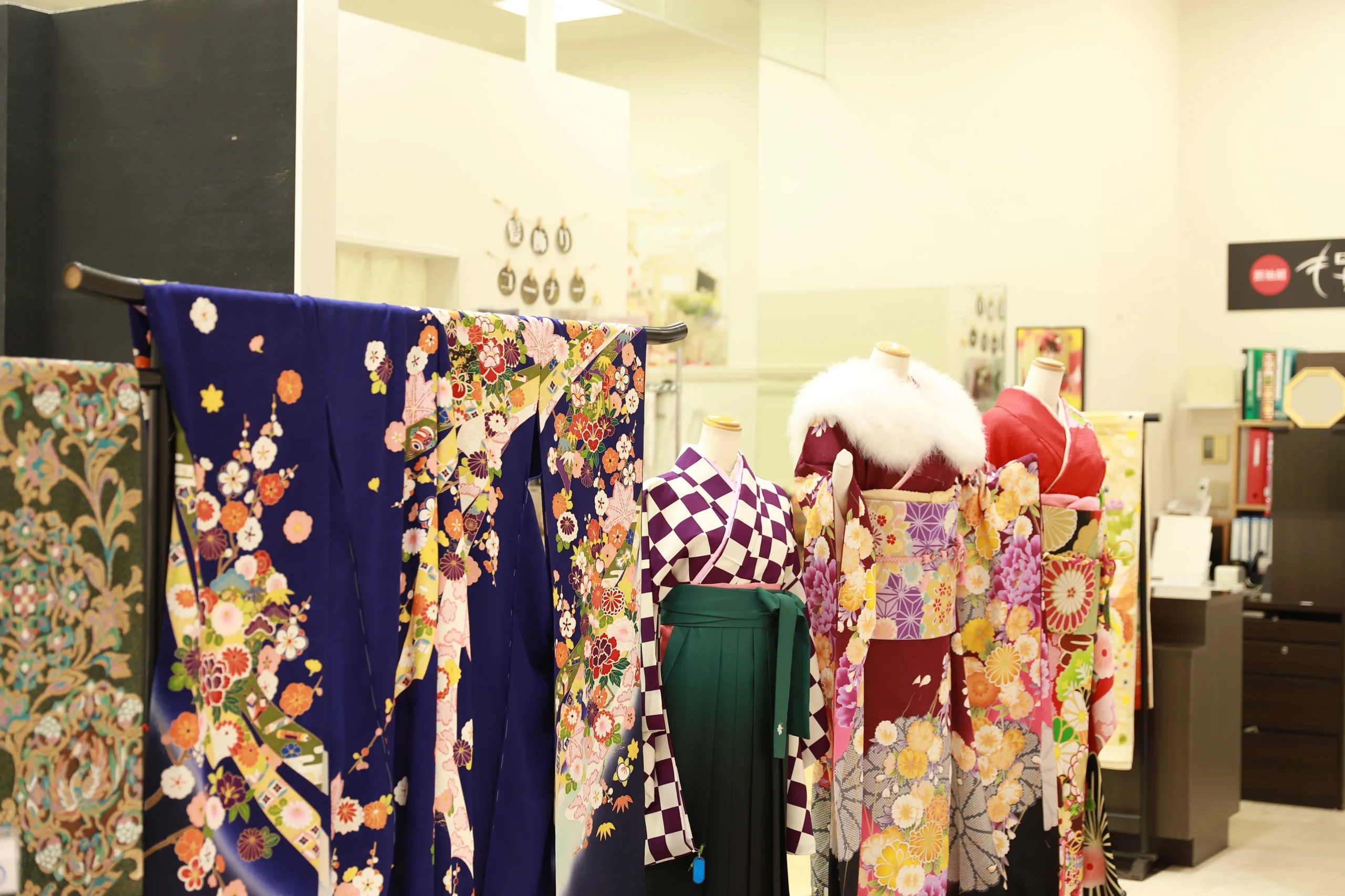 ご成人のお客様のためのご購入振袖・レンタル振袖や、ご卒業式用の袴はもちろん、お宮参りや七五三をお迎えになるお子様のための小袖や袴、そしてご家族様の訪問着や振袖など、たくさんご用意しております。